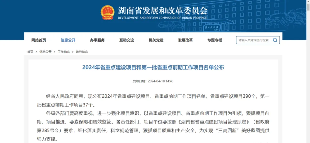 4月10日,湖南省发改委公布2024年省重点建设项目、省重点前期工作项目名单。今年,全省铺排省重点建设项目390个,总投资2.3万亿元,年度计划投资4715亿元。