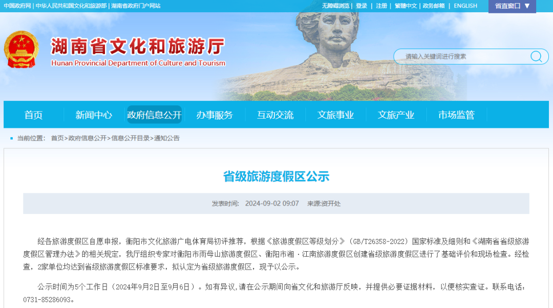 经各旅游度假区自愿申报,衡阳市文化旅游广电体育局初评推荐,根据《旅游度假区等级划分》(GB/T26358-2022)国家标准及细则和《湖南省省级旅游度假区管理办法》的相关规定,我厅组织专家对衡阳市雨母山旅游度假区、衡阳市湘·江南旅游度假区创建省级旅游度假区进行了基础评价和现场检查。经检查,2家单位均达到省级旅游度假区标准要求,拟认定为省级旅游度假区,现予以公示。