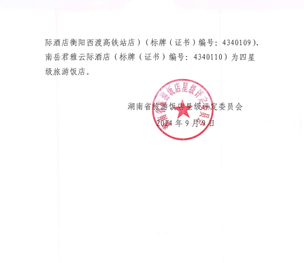 祝贺!衡东县金城一佳大酒店成功评定为四星级旅游饭店