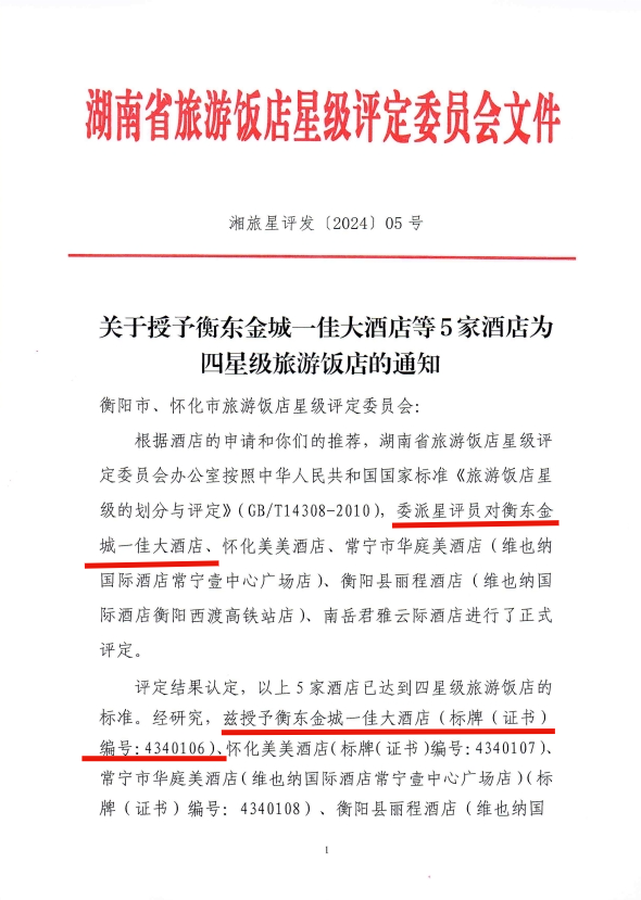 近日,湖南省旅游饭店星级评定委员会办公室发布了全省最新评定的5家四星级旅游饭店公示名单,衡东县金城一佳大酒店光荣上榜!