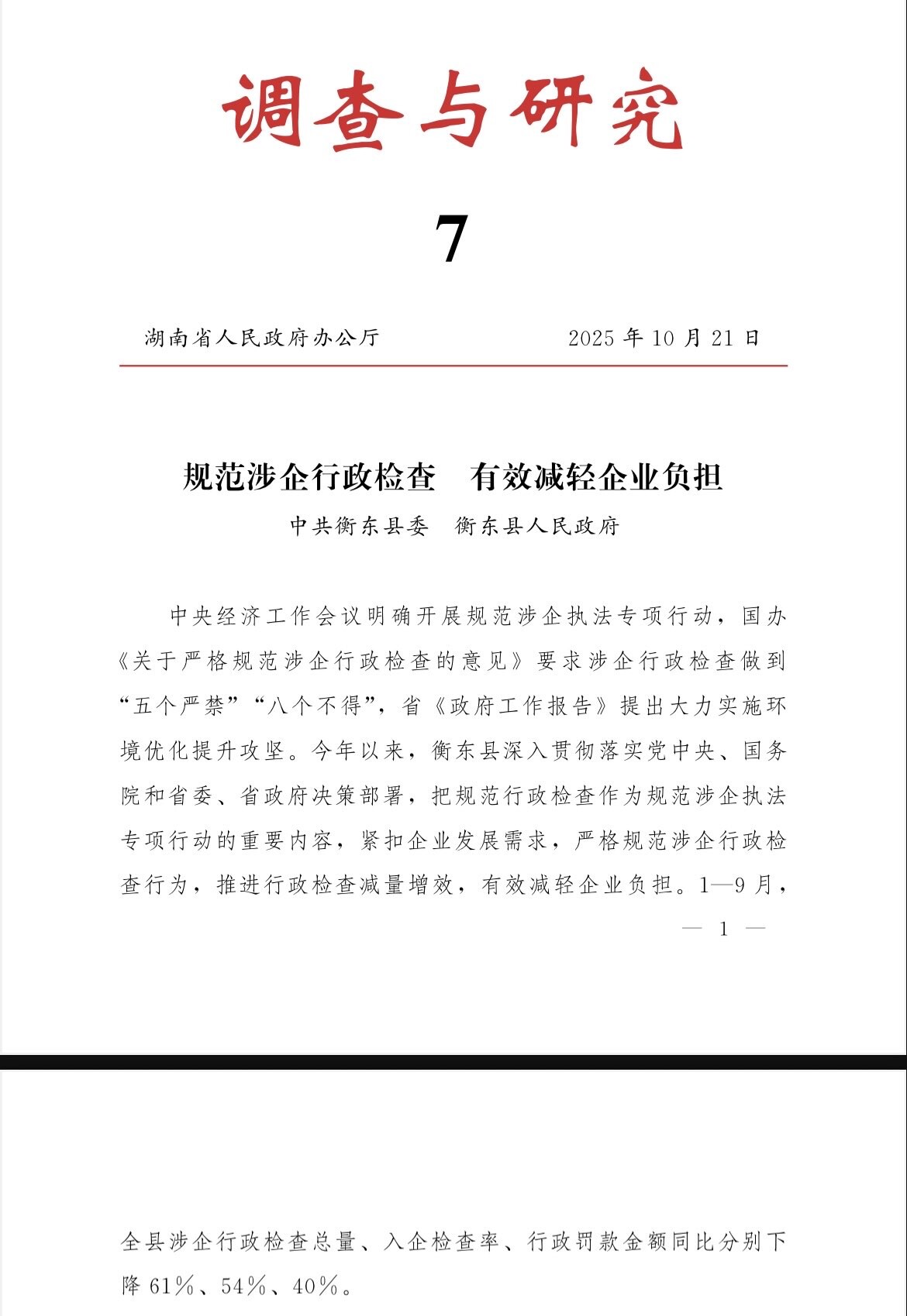 省政府充分肯定:“今年以来,衡东县深入贯彻落实党中央、国务院和省委、省政府决策部署,把规范行政检查作为规范涉企执法专项行动的重要内容,紧扣企业发展需求,严格规范涉企行政检查行为,推进行政检查减量增效,有效减轻企业负担。1-9月,全县涉企行政检查总量、入企检查率、行政罚款金额同比分别下降61%、54%、40%.”