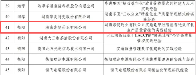 近日,湖南省工业和信息化厅正式公布《2025年度湖南省制造业质量标杆企业名单​,其中,我县湖南东健药业有限公司凭借“实施龟甲胶智能智造数字化生产质量管控的实践经验”成功入选该名单