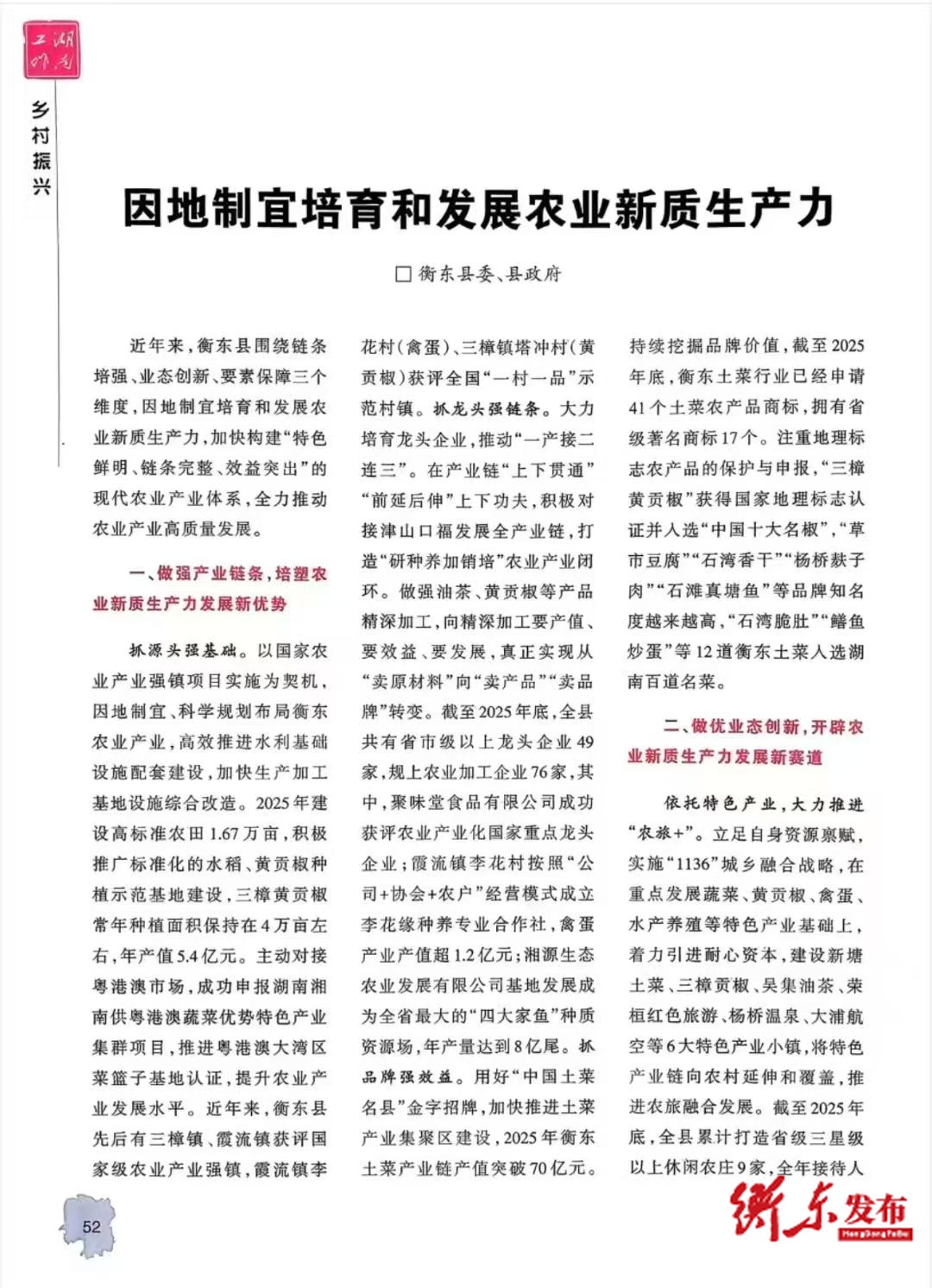 近日,衡东县《因地制宜培育和发展农业新质生产力》获《湖南工作》(2026年第2期)刊载推介。全文如下: